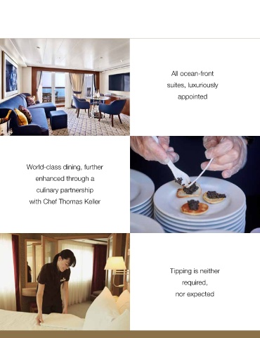 All ocean-front suites, luxuriously appointed World-class dining, further enhanced through a culinary partnership with Chef Thomas Keller Tipping is neither required, nor expected