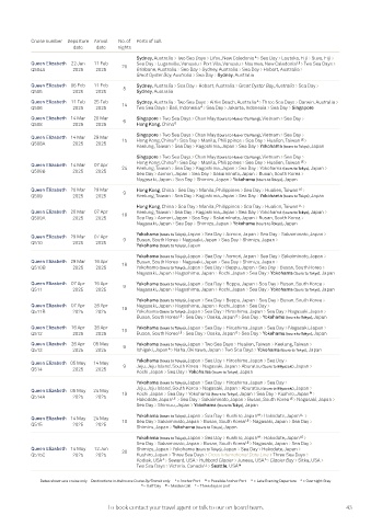Q435 2024 2024 Sydney, Australia Q510B 2025 2025 18 Yokohama (tours to Tokyo), Japan > Sea Day > Beppu, Japan > Sea Day > Busan, South Korea > ASIA