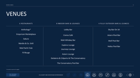 6 RESTAURANTS 8 INDOOR BARS & LOUNGES 4 FULLY OUTDOOR BARS & LOUNGES