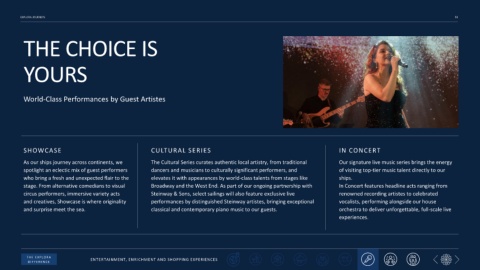 circus performers, immersive variety acts Steinway & Sons, select sailings will also feature exclusive live renowned recording artistes to celebrated