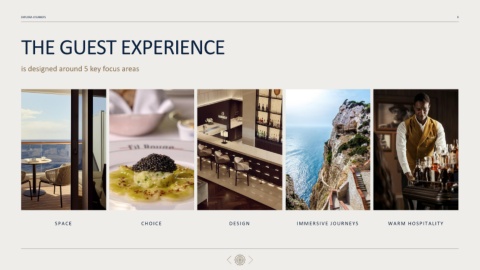 EXPLORA JOURNEYS 9 THE GUEST EXPERIENCE is designed around 5 key focus areas SPACE CHOICE DESIG N IMMERSIVE JOURNEYS WARM HOSPITALITY A black and gold logo AI-generated content may be incorrect.