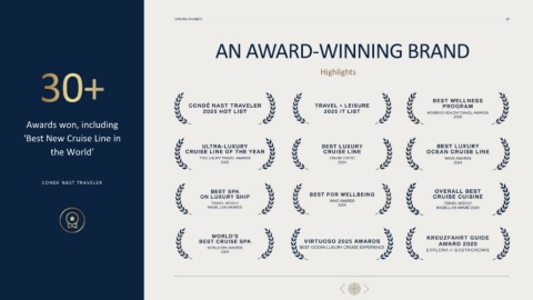 EXPLORA JOURNEYS 10 AN AWARD-WINNING BRAND 30+ Highlights Awards won, including ‘Best New Cruise Line in the World’ CONDE NAST TRAVELER A black and gold logo AI-generated content may be incorrect.